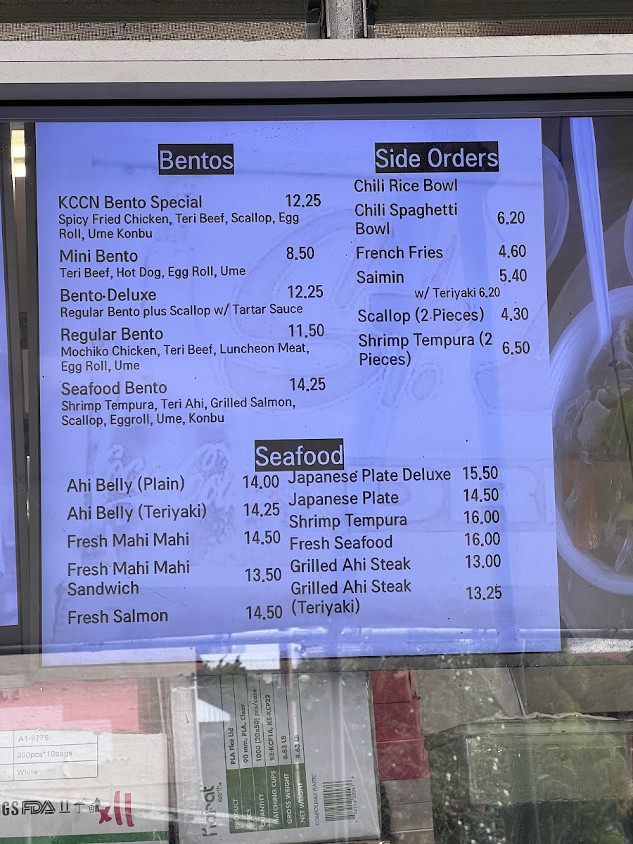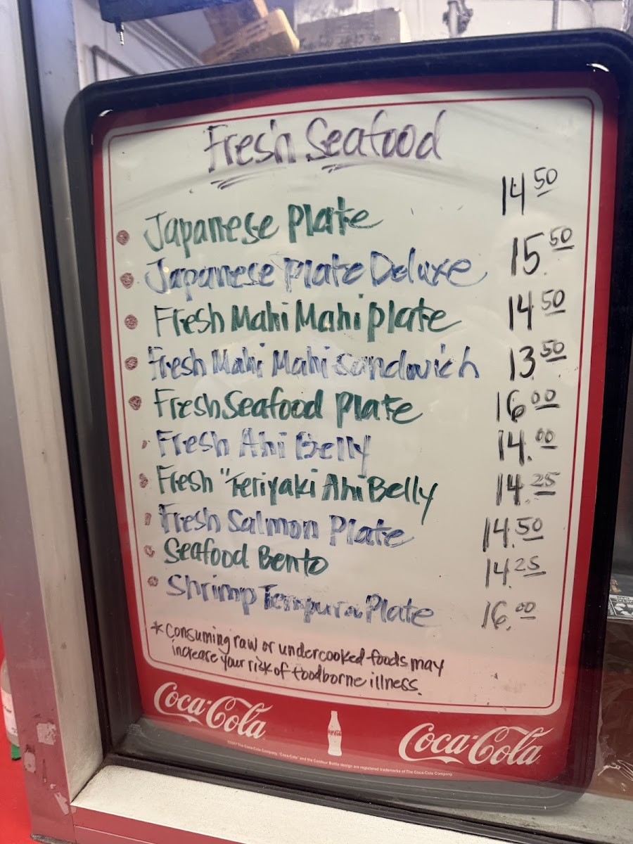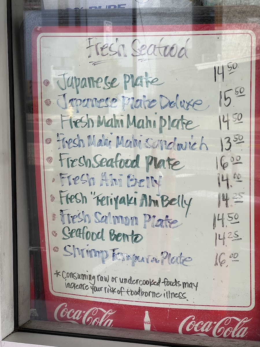 The menu features a variety of Hawaiian-style plate lunches and seafood dishes, focusing on fresh ingredients and traditional preparation methods. Visitors can expect options such as Japanese Plates, including sashimi and shrimp tempura combinations, as well as a selection of teriyaki-based entrees like Teriyaki Beef and Teriyaki Steak Plates. The seafood offerings highlight fresh mahi mahi served as a grilled plate or sandwich, alongside fresh ahi sashimi.