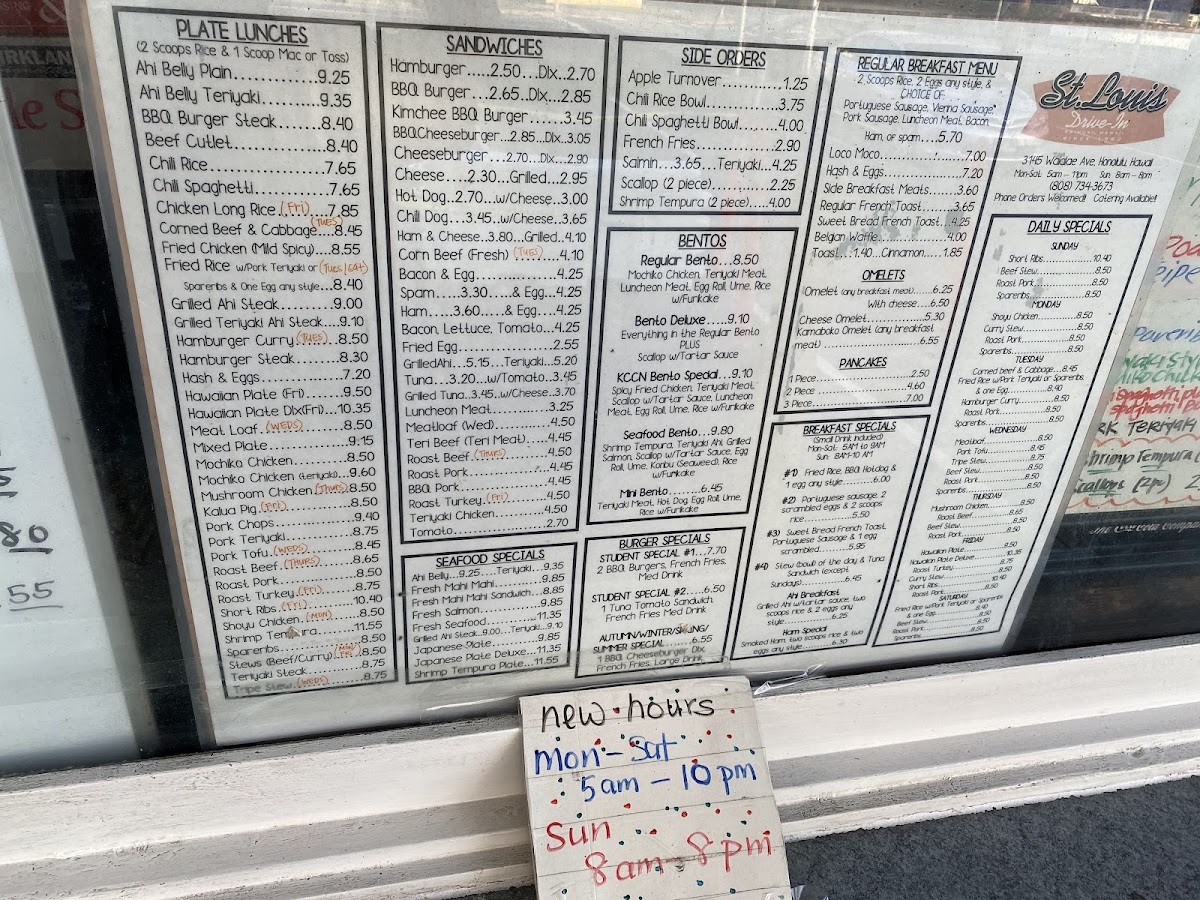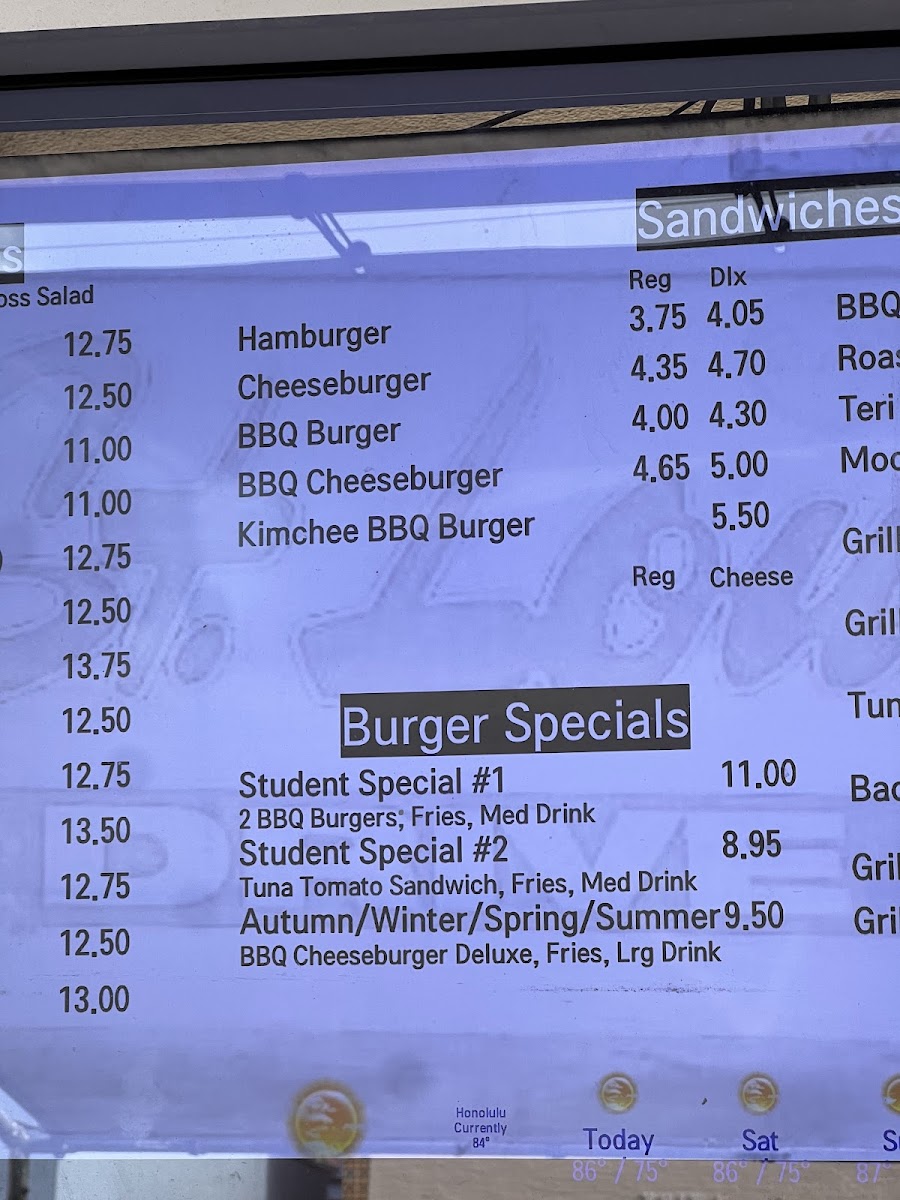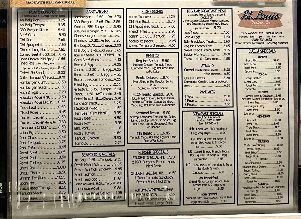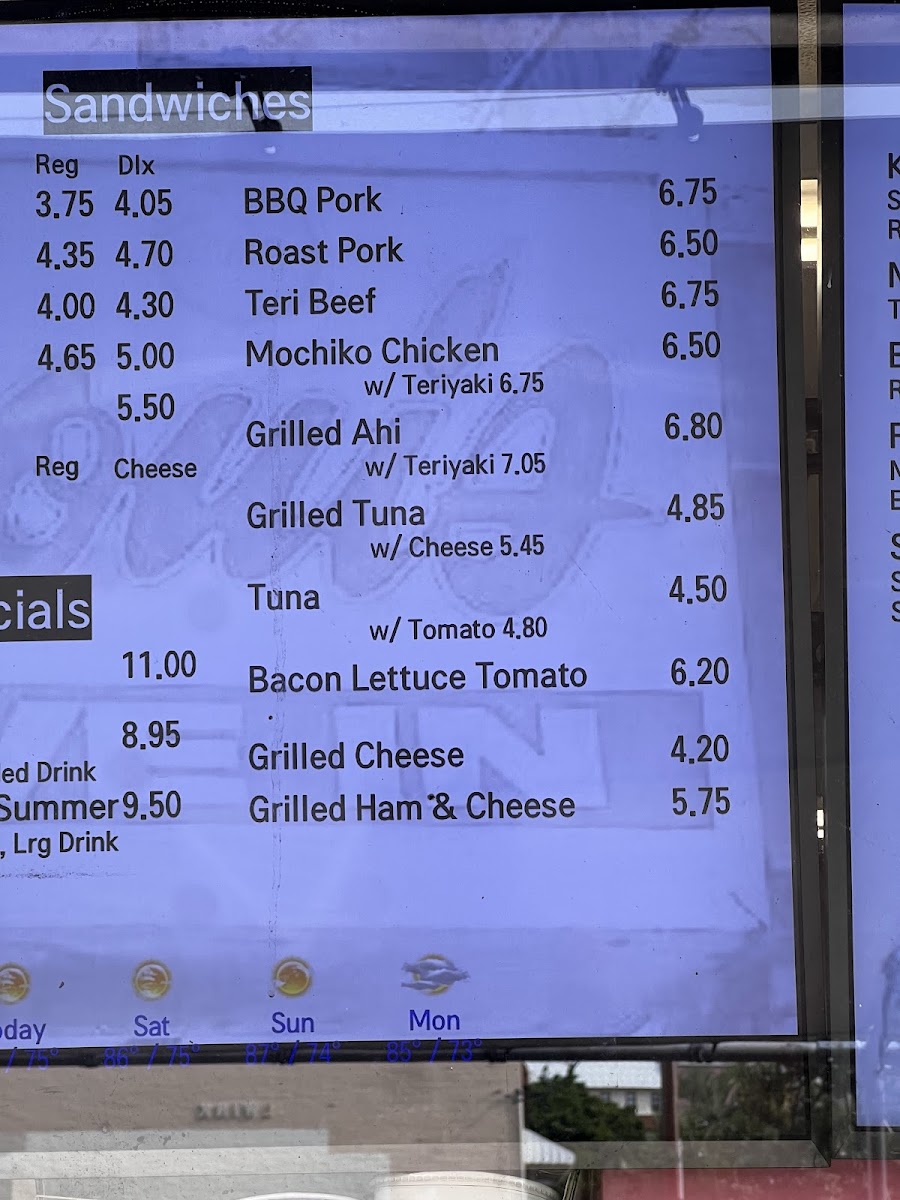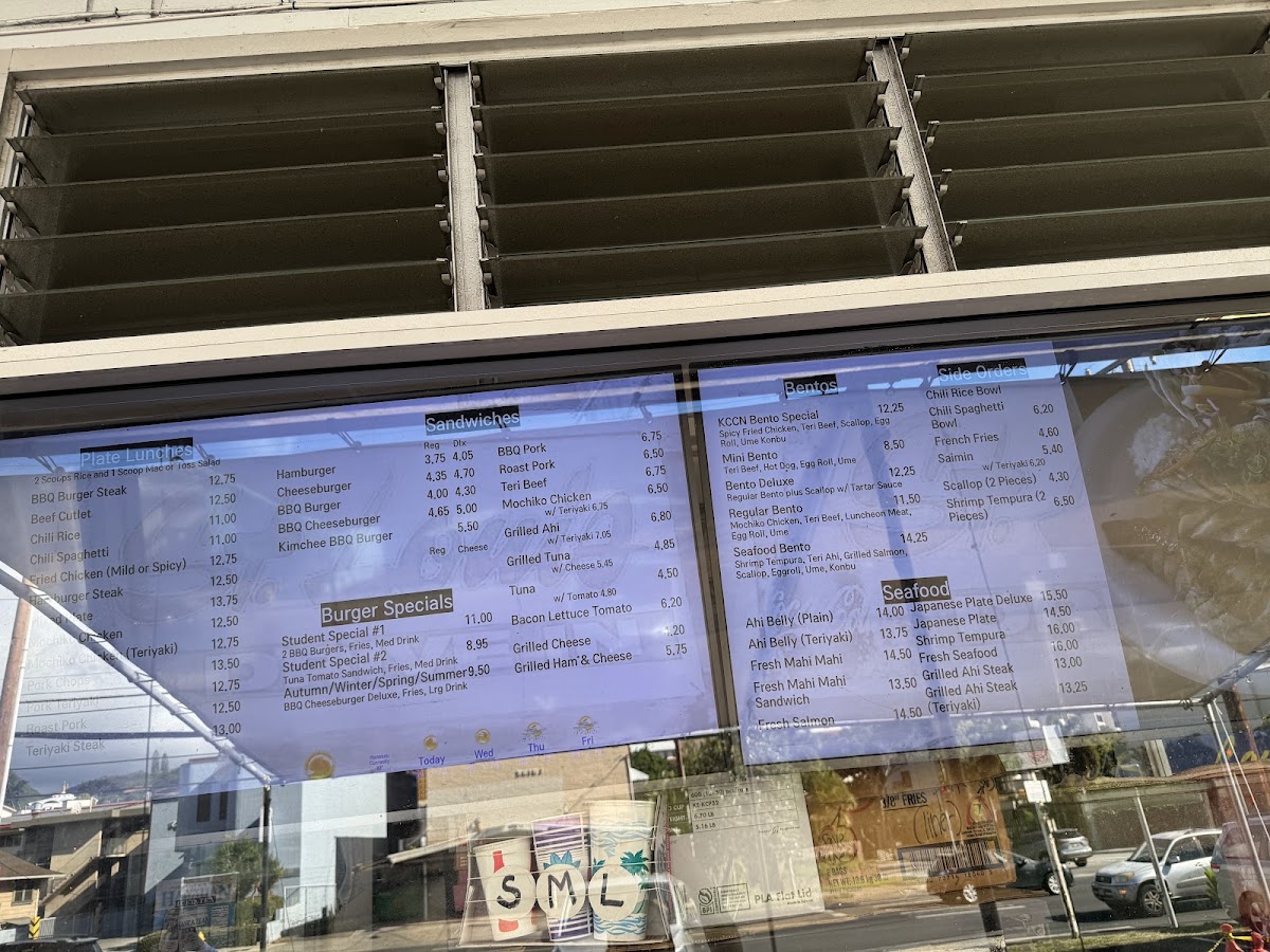 This menu is suitable for breakfast and lunch, providing quick and casual dining options with a focus on plate lunches and Hawaiian comfort food. Customers typically place orders for individual plates featuring a main protein, rice, and sides. The menu’s structure supports straightforward selection for those seeking a traditional local meal experience.